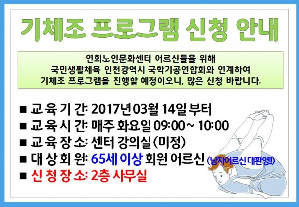 제목 | 기체조 프로그램 신청 안내 페이지 정보 작성자 |관리자 작성일 |17-03-02 16:12 조회 |2,395회 이전글 다음글 목록 본문 . 이전글 다음글 목록 이전글스마트폰, 컴퓨터 프로그램 자원봉사자 모집 다음글2017년 연희노인문화센터 대체인력(사회복지사) 채용 합격자 명단 공고