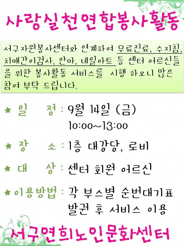 제목 | 어르신을 위한 사랑실천연합봉사활동 페이지 정보 작성자 |관리자 작성일 |12-09-04 09:55 조회 |2,566회 이전글 다음글 목록 본문 . 이전글 다음글 목록 이전글서구연희노인문화센터 한국무용 동아리 강사모집 채용자 명단 다음글서구연희노인문화센터 한국무용 동아리 강사모집 공고