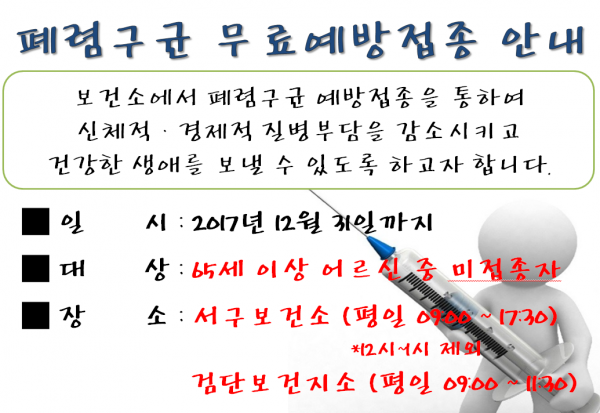 제목 | 폐렴구균 무료예방접종 안내 페이지 정보 작성자 |관리자 작성일 |17-08-25 10:43 조회 |1,269회 이전글 다음글 목록 본문 서구보건소 (032-560-5053) / 검단보건지소 (032-560-3405) 이전글 다음글 목록 이전글2017년 서구연희노인문화센터 프로그램 강사(오카리나, 기타반) 합격자 명단 다음글이·미용 자원봉사자 모집 안내