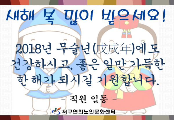 제목 | 2018년도 새해 복 많이 받으세요~ 페이지 정보 작성자 |관리자 작성일 |18-01-03 15:33 조회 |1,154회 이전글 다음글 목록 본문 . 이전글 다음글 목록 이전글2018년 연희노인문화센터 계약직 직원 채용 계획 공고 다음글2018년 상반기 프로그램 안내지(2018.4.23 업데이트)