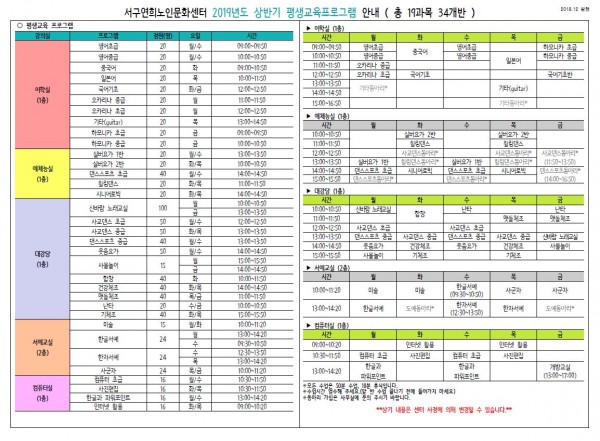 제목 | **2019년 상반기 평생교육프로그램 접수안내** 페이지 정보 작성자 |관리자 작성일 |19-01-22 11:26 조회 |1,797회 이전글 다음글 목록 본문 2019년 상반기 평생교육 프로그램 입니다. 사진을 클릭하면 크게 볼수 있습니다. 이전글 다음글 목록 이전글***2019년 서구연희노인문화센터 프로그램 강사 모집 (재공고)-사교댄스 초/중급*** 다음글<인천시민안전보험 안내>