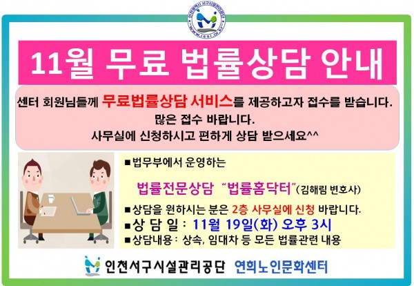 제목 | 11월 무료법률상담 안내 페이지 정보 작성자 |관리자 작성일 |19-11-07 14:08 조회 |947회 이전글 다음글 목록 본문 2019.11.19(화) 오후 3시 법률상담 필요하신 분은 사무실에 신청 바랍니다. 이전글 다음글 목록 이전글***동아리 회원 모집 안내*** 다음글2019년 하반기 정보화교육 프로그램 2차 접수 선정자 발표
