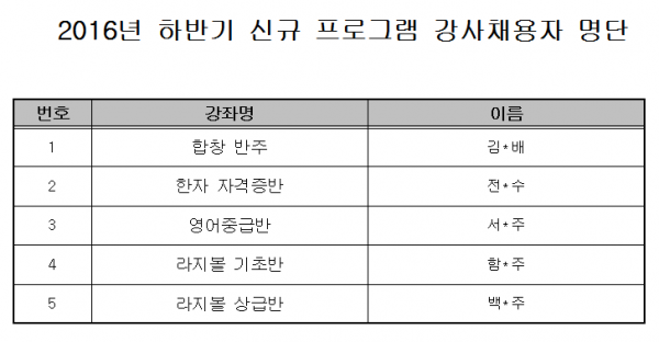 2016년 하반기 신규프로그램 강사 합격자 명단 페이지 정보 작성자 관리자 댓글 0건 조회 1,887회 작성일 16-07-19 09:42 본문 아래와 같이 2016년 하반기 신규프로그램 강사 합격자 명단을 발표합니다. 목록 이전글8월 무료 이미용 서비스안내 다음글***2016년 하반기 프로그램 강사(반주자) 모집 공고*** 댓글목록 댓글목록 등록된 댓글이 없습니다.