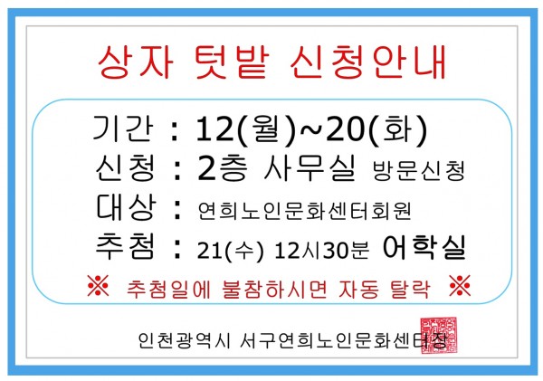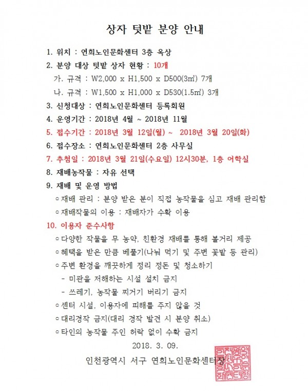 2018년 상자텃밭 분양 및 신청안내 페이지 정보 작성자 관리자 댓글 0건 조회 1,107회 작성일 18-03-09 16:12 본문 *상기 안내된 기간에 신청하시기 바랍니다. 목록 이전글***2018년 서구연희노인문화센터 프로그램(기체조) 강사 모집 공고*** 다음글2018년 3월 이미용 봉사일정 안내 (마감) 댓글목록 댓글목록 등록된 댓글이 없습니다.