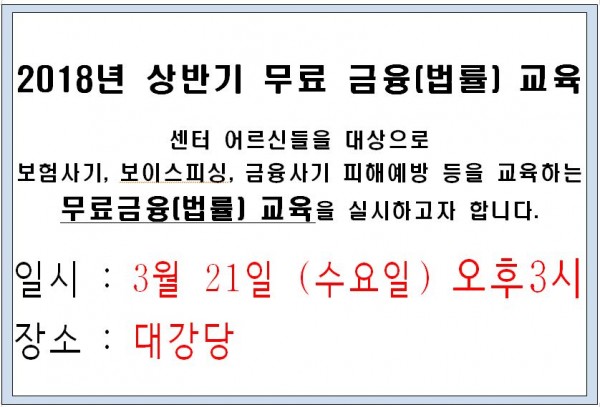 2018년도 무료 금융(법률)교육 안내 페이지 정보 작성자 관리자 댓글 0건 조회 951회 작성일 18-03-13 13:52 본문 . 목록 이전글2018년 4월 이미용 봉사일정 안내 다음글***2018년 서구연희노인문화센터 프로그램(기체조) 강사 모집 공고*** 댓글목록 댓글목록 등록된 댓글이 없습니다.