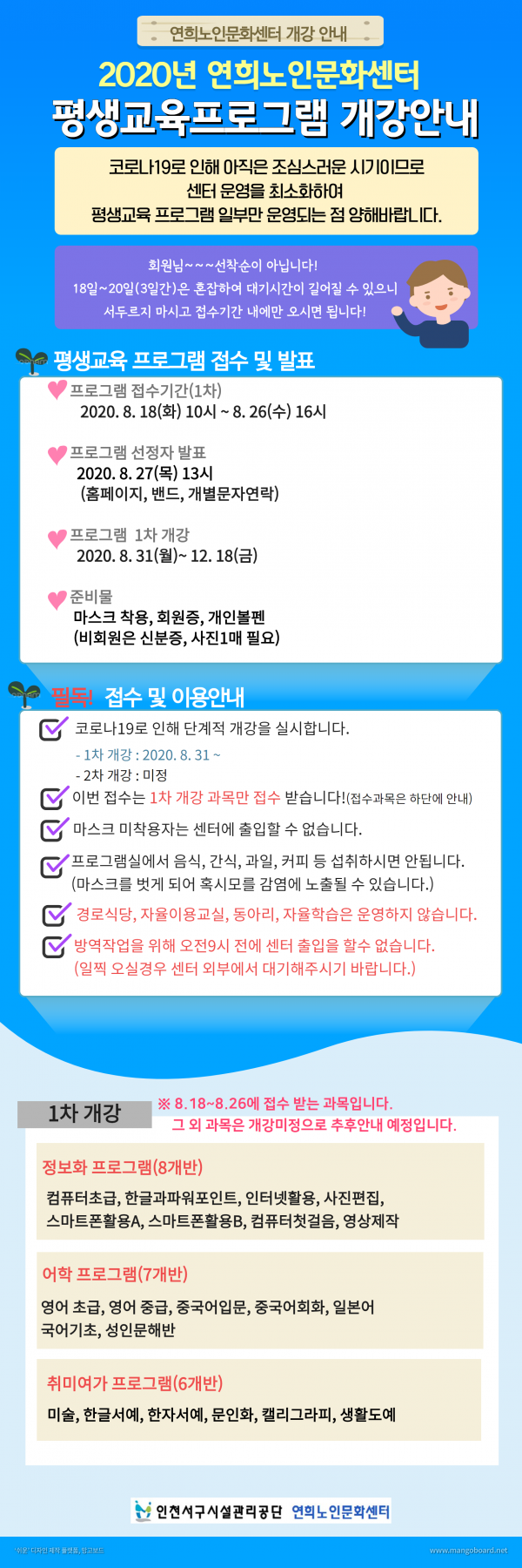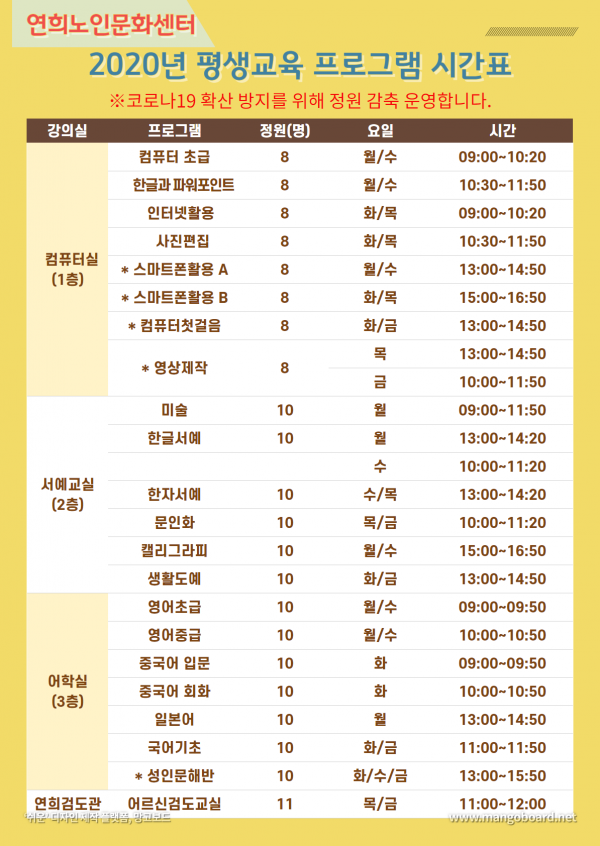 2020년 평생교육프로그램 개강안내 및 시간표 페이지 정보 작성자 관리자 댓글 0건 조회 954회 작성일 20-08-11 16:32 본문 --- 목록 이전글[394번 공지글 관련]2020 평생교육 프로그램 수강 신청 잠정 연기 안내 다음글[코로나19포스토]-마스크착용! 댓글목록 댓글목록 등록된 댓글이 없습니다.